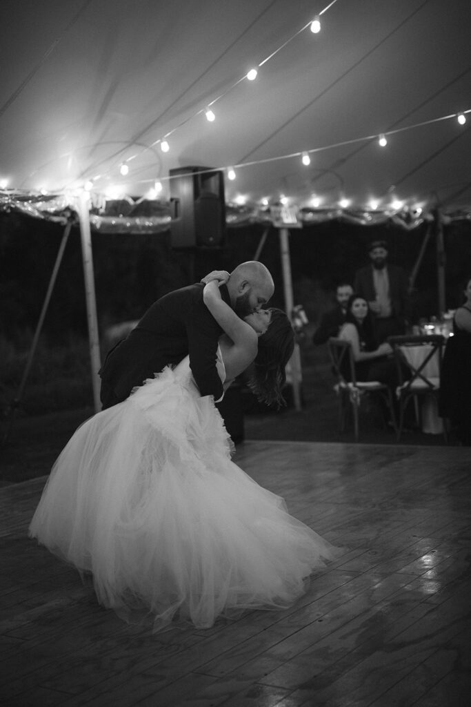 The evening began with a beautiful first dance beneath strings of light. From there, heartfelt toasts followed and the dance floor stayed full well into the night. Caroline’s gown transformed for the reception with a second look that felt playful and effortless for dancing while still keeping its romantic character. Laughter, music, shared cake bites, and spontaneous moments carried the celebration forward, bringing their Stone Acres Farm wedding to a joyful close.